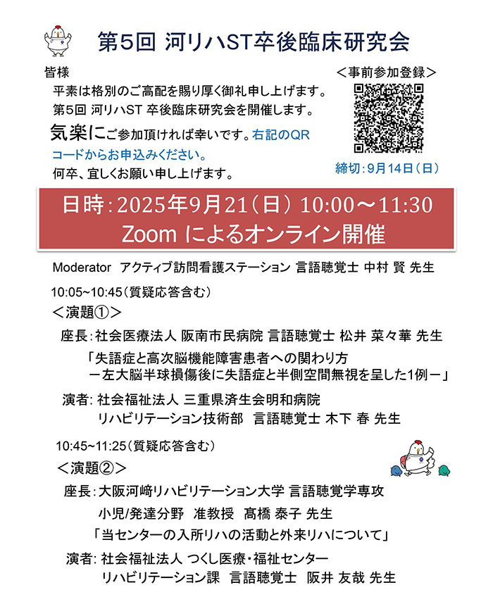 卒業生の方へ GRADUATE 和泉大学 卒業生の方へ 9/21(日) 第5回 ST卒後臨床研究会 2025.09.21 9/21(日) 第5回 ST卒後臨床研究会 現場で活躍するSTの実践報告を通して、臨床に役立つ学びを共有します。 職種に関わらず、興味のある方はぜひご参加下さい! 日程 2025年9月21日(日)10:00~11:30 内容 形式:Zoomによるオンライン開催(事前申込制) 講師:言語聴覚学専攻 上田有紀人 申し込み 申し込みフォーム 締切日:9月14日(日) オススメ最新情報!