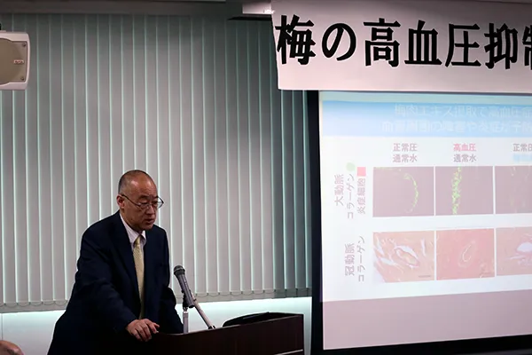 過去の研究で、梅肉エキスは、アンジオテンシンIIという血圧を上昇させるホルモンの働きを抑制することを報告したが、今回の研究において、通常の水を与えられたマウスと梅肉エキス入りの水を与えられたマウスを比較し、梅肉エキス入りの水を摂取したマウスは血圧が正常値に保たれ、血管の炎症や心臓肥大も抑制された。