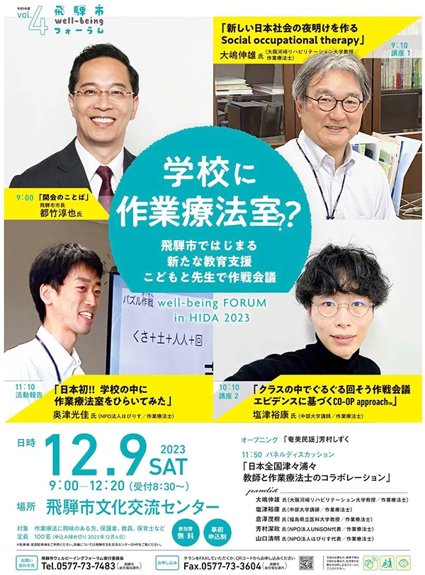 12月9日(土)飛騨市文化交流センターにて、本学学科長の大嶋伸雄先生が、「学校に作業療法室??」というテーマで、飛騨市ではじまる新たな教育支援に参加されます✨