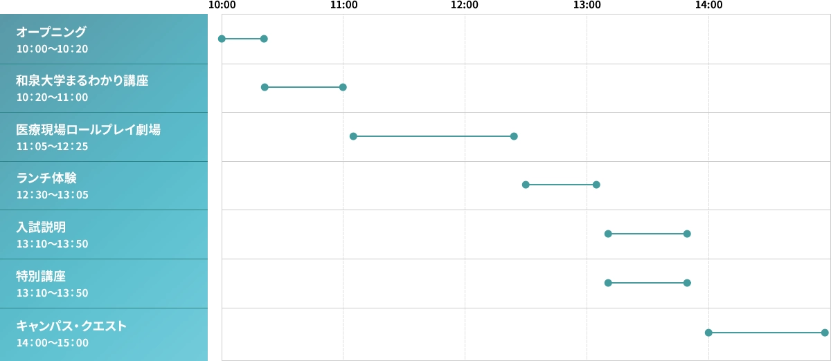 キャンパス探検や入試相談、リハビリテーション分野を楽しく学べる体験プログラムなど、気になるプログラムに自由に参加OK!時間内なら、途中からの参加や移動もできるので、「ちょっと見てみたい」「あれもこれも体験したい!」が全部叶います!友だちと一緒にキャンパスを回ったり、体験プログラムをハシゴしたり、楽しみ方はあなた次第!